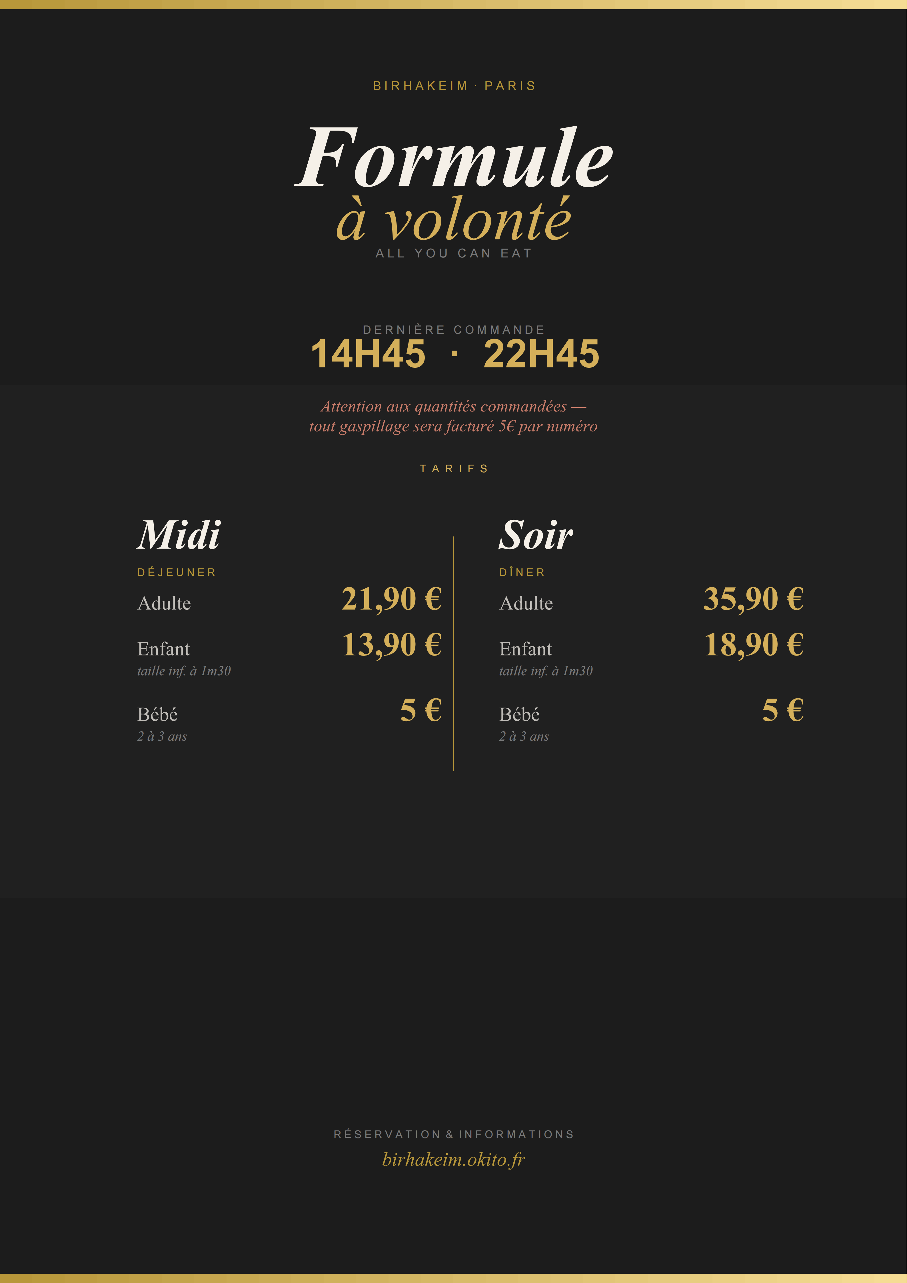 2 soupes, 2 salades, 2 riz, 20 sashimi assortis, 4 sushi, 6 maki, 8 brochettes (2 poulet, 2 boulettes de poulet, 2 boeuf, 2 boeuf au fromage)